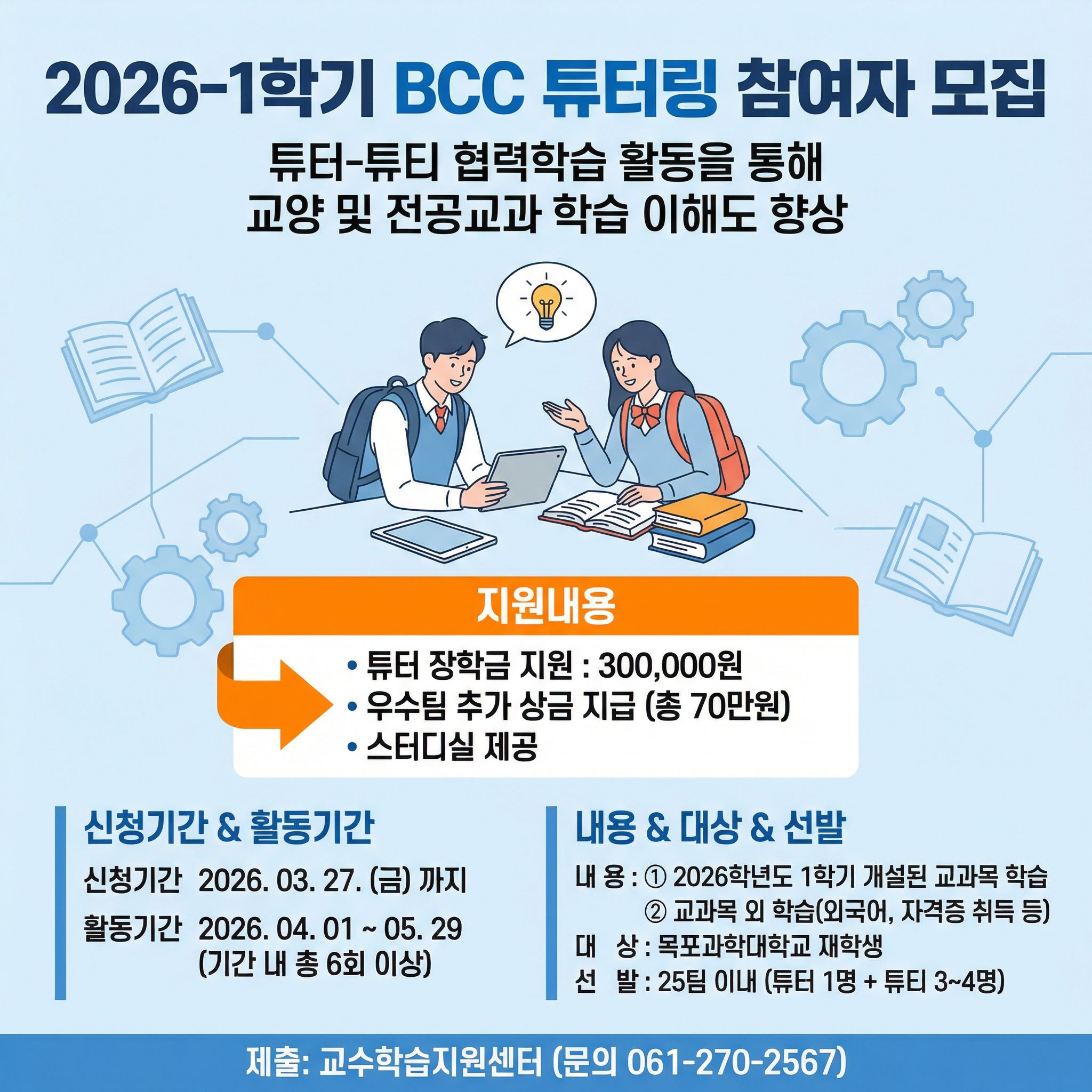 재학생 간 협력학습을 통해 학습 이해도를 높이고 학업 수행 능력 향상을 지원하는 BCC 튜터링 참여자를 모집합니다.